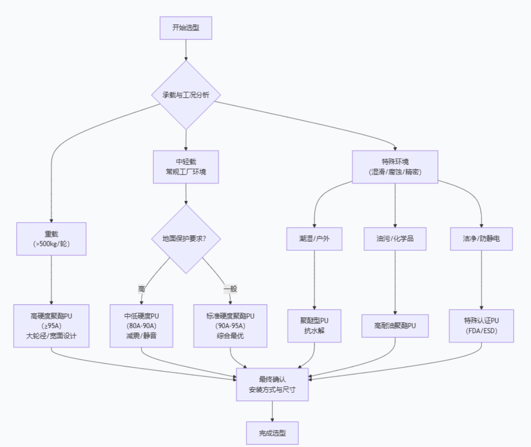 选择聚氨酯包胶轮是一项需要综合考虑多个技术参数和应用场景的工作。小编将为您梳理一套系统性的选品方法,帮助您做出精准决策